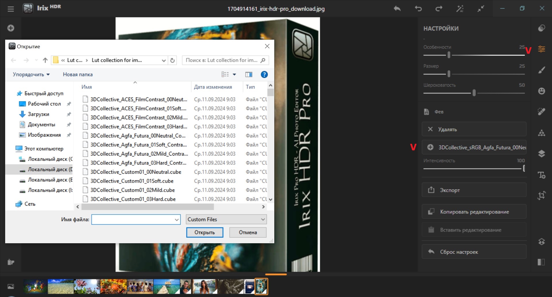 • LUT — импорт LUT в форматах .CUBE, .VF, .3DL. Создайте свои собственные LUT в виде файла .CUBE