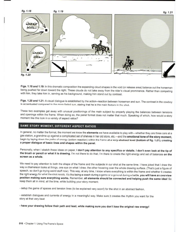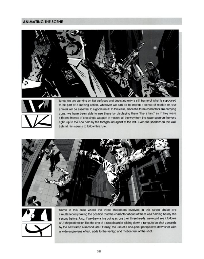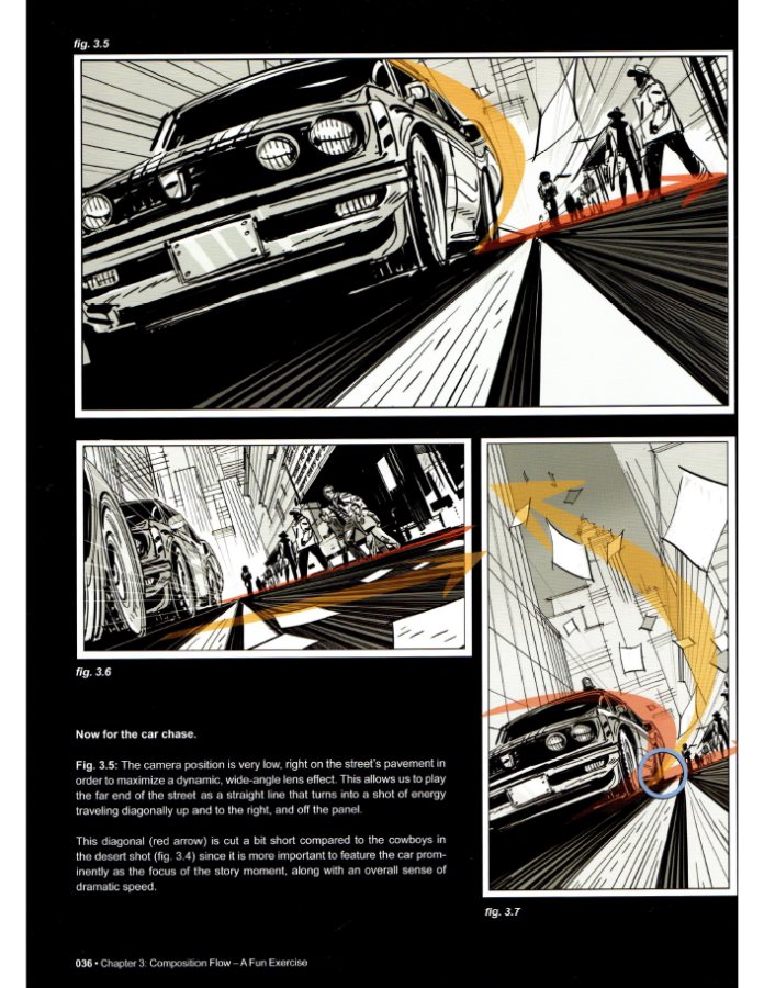 После краткой вводной в искусство повествования, Маркос знакомит нас с рисованием и композицией единого образа, который поможет составить серию емких кадров для зарисовок и создать последовательность между ними. Все уроки наглядно демонстрируются в трех различных сюжетных линиях – железнодорожное происшествие, история ковбоя и приближение байкеров к таинственному дому.