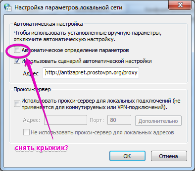 так ведь это не расширение. 1. Надо ли крыжик снять с «автоматическое определение параметров»? 2. Не снизится ли скорость если Вставить ссылку http://antizapret.prostovpn.org/proxy.pac в строку "Использовать сценарий автоматической настройки"?