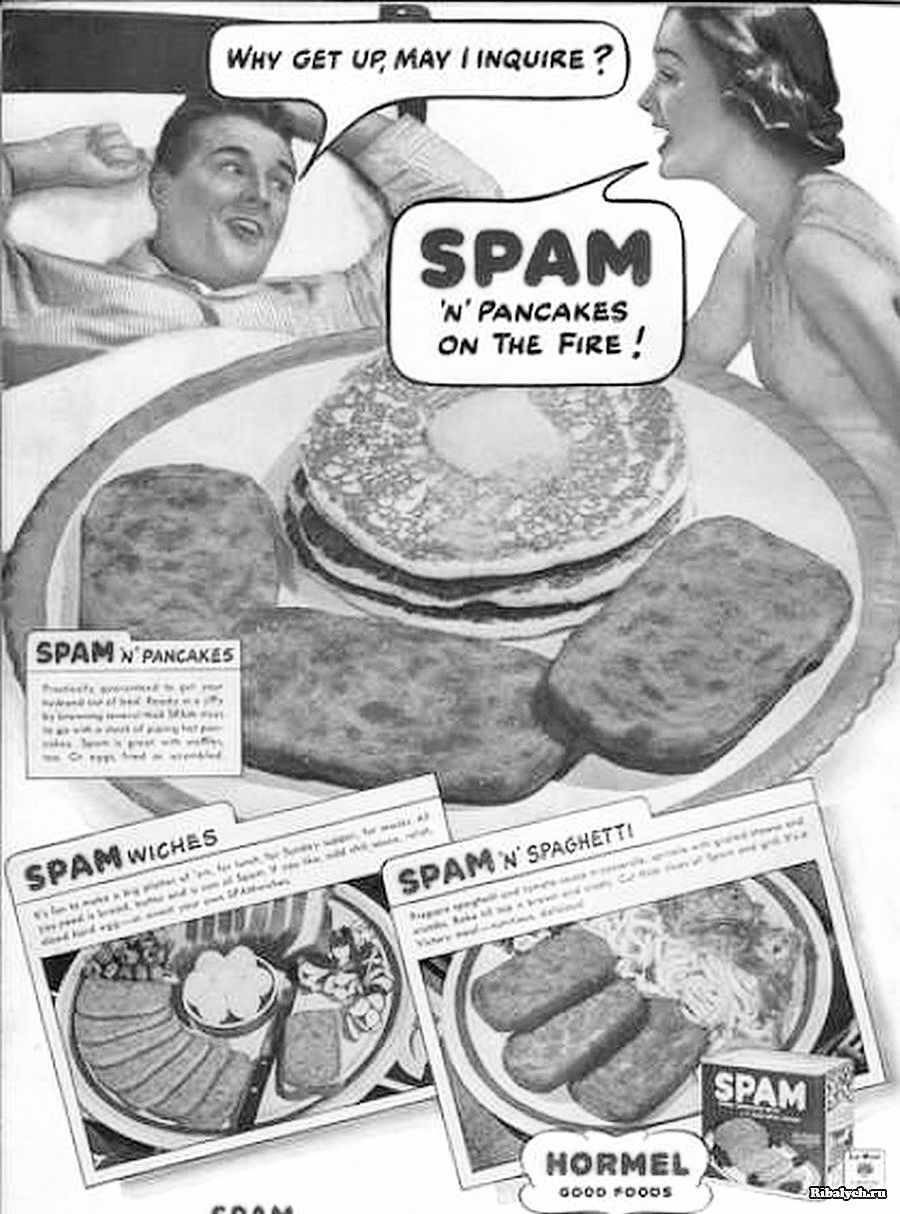 Рекламный плакат консервов SPAM - тех самых, чьё название позже стало синонимом навязчивых рассылок. 1936 год. |