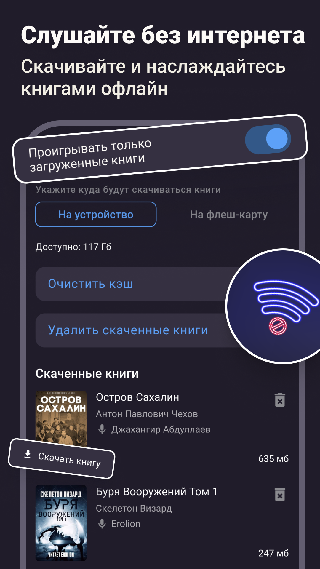 • Хотите слушать аудиокниги без интернета? Скачивайте книги на смартфон, чтобы наслаждаться ими офлайн, например, в роуминге или в режиме полета;