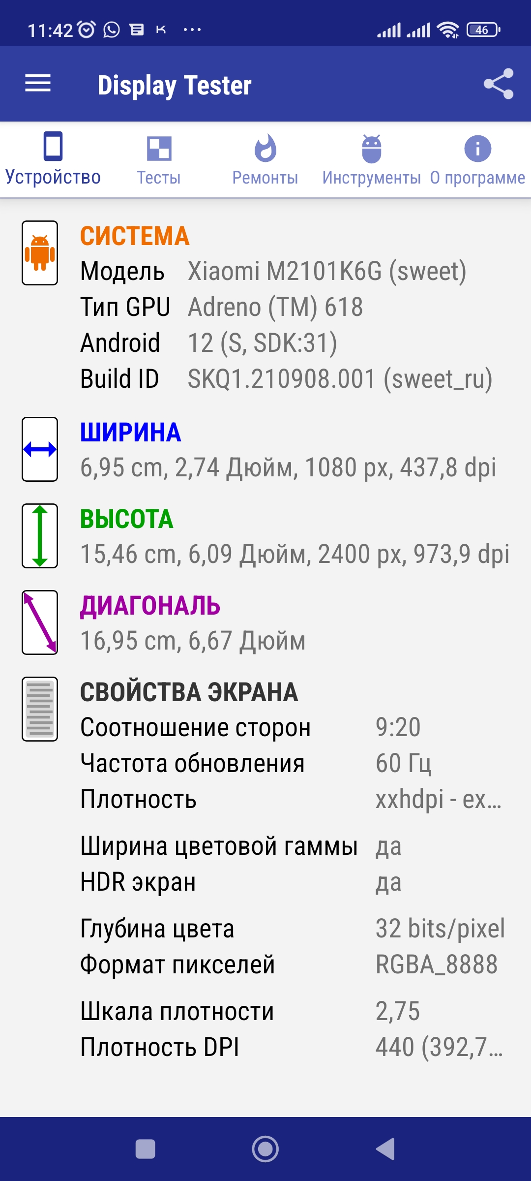 ◆ Отображение информации о размерах: размер экрана, тип графического процессора, dpi, независимо от плотности и размера пикселя, информация OpenGL 1.x, формат пикселя