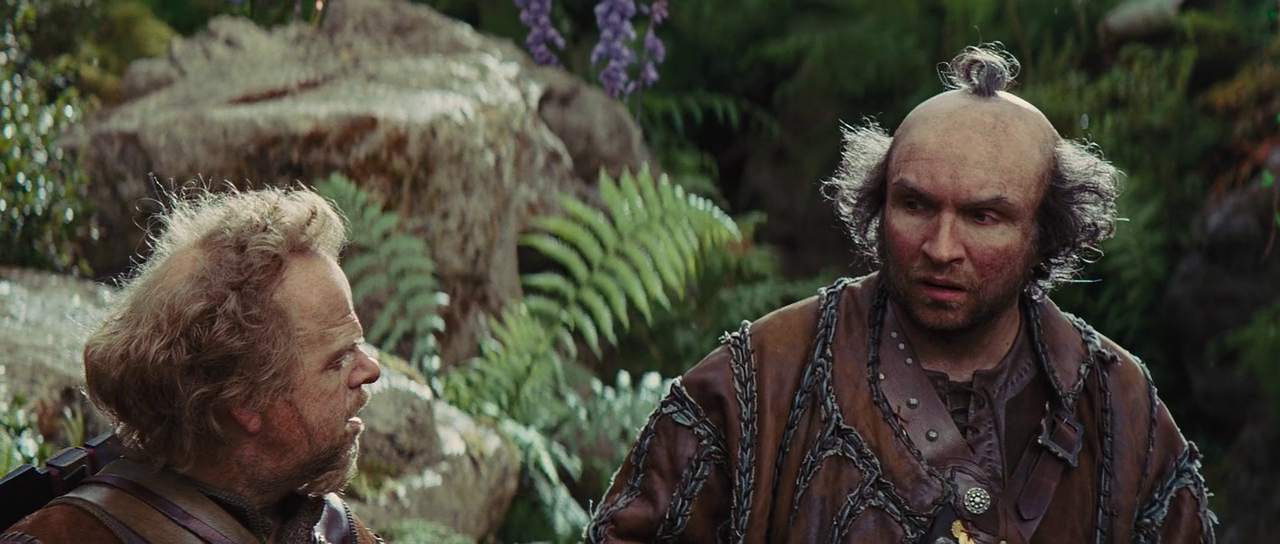 История сказки, не уложившаяся в экранный формат длительности и не предусмотревшая пространство для развития характеров, нашла искусственное расширение в виде военного экшна, где севшая на коня девица Белоснежка превращается в подобие Жанны д’Арк в исполнении Миллы Йовович, которую Охотник натаскивает по части боевых искусств. Режиссер не пощадил актрису и в числе прочих испытаний на тернистом пути через зачарованный лес заставил бедняжку, к примеру, ползти по узкой канализационной трубе, кишащей самыми настоящими живыми крысами. Таким образом, она полновесно проходит обряд инициации, вообще-то предназначенной юношам, но поскольку у нас тут силен мотив матриархата, то и на принцессу может быть распространен. Камера Грега Фрайзера подолгу следит за тем, как команда засланных в тыл неприятеля гномов справляется с поворотным колесом, чтобы открыть ворота города армии повстанцев. И с особым вниманием — за ландшафтом зачарованного леса с гигантскими глазастыми грибами, то пропитанного злом черной магии, то освещенного прелестью, дарованной феями и эльфами. Собственно, природный ландшафт и природный замок суть главные герои фильма, через которых ведется повествование. Процесс обескровливания страны и народа под властью вампирессы Равенны иллюстрируется не бедностью и жалостным истощением людских ресурсов, а впечатляющим визуальным омертвением окружающей среды, руинизацией, преобладанием сухостоя и кроваво-красного цвета флагов на фоне общей обесцвеченности.